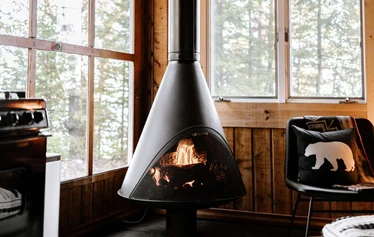 Tämä kotoisa hirsimökki sijaitsee kuvankauniissa järvimaisemassa.